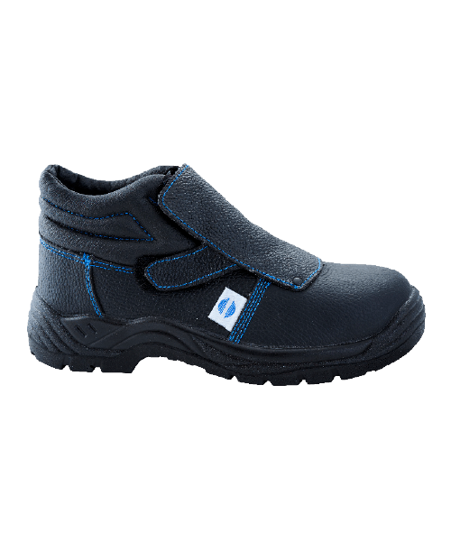 Flor de piel negra hidrofugada, cierre de velcro con cordón interior de poliamida de alta resistencia, suela de poliuretano de doble densidad, puntera de acero inoxidable y plantilla antiperforación de acero.