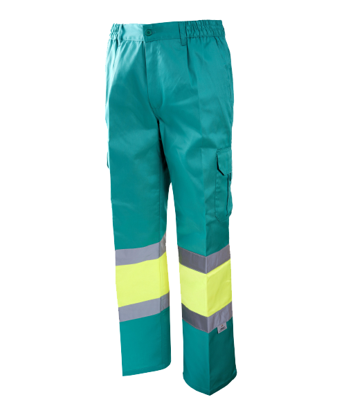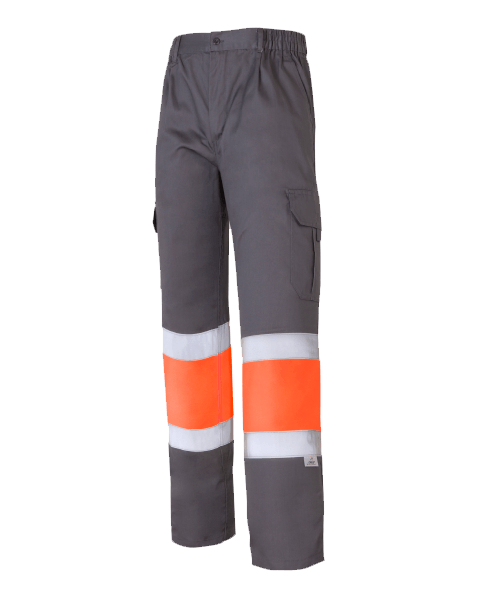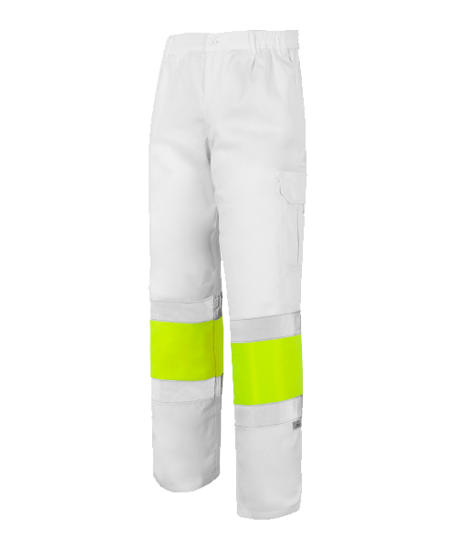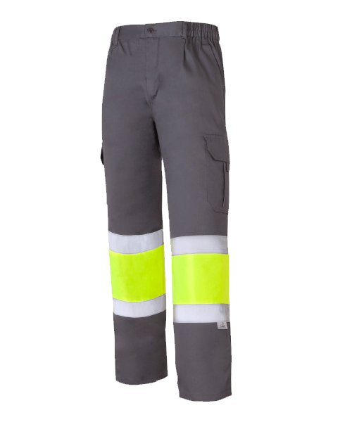 Laterales elásticos en cintura, cierre de botón y cremallera, 2 bandas reflectantes horizontales en perneras de 5 cm de ancho.
